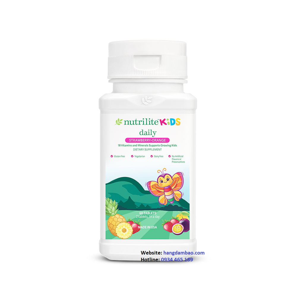 CUNG CẤP VITAMIN & KHOÁNG CHẤT THIẾT YẾU CHO TRẺ Mỗi viên Vitamin & Khoáng chất tổng hợp NUTRILITE Nutrilite KiDS Daily - Trẻ em bổ sung 11 loại vitamin A, B1, B2, niacin, B6, folate, B12, C, D, E và pantothenate cùng 4 khoáng chất thiết yếu là canxi, sắt, đồng, kẽm hỗ trợ sự phát triển của trẻ. Loạt vi chất này đặc biệt phù hợp cho việc hỗ trợ tăng cường sức khỏe cho trẻ gầy yếu, thiếu vi chất, biếng ăn và suy dinh dưỡng, giúp hỗ trợ cho sự phát triển của trẻ.
