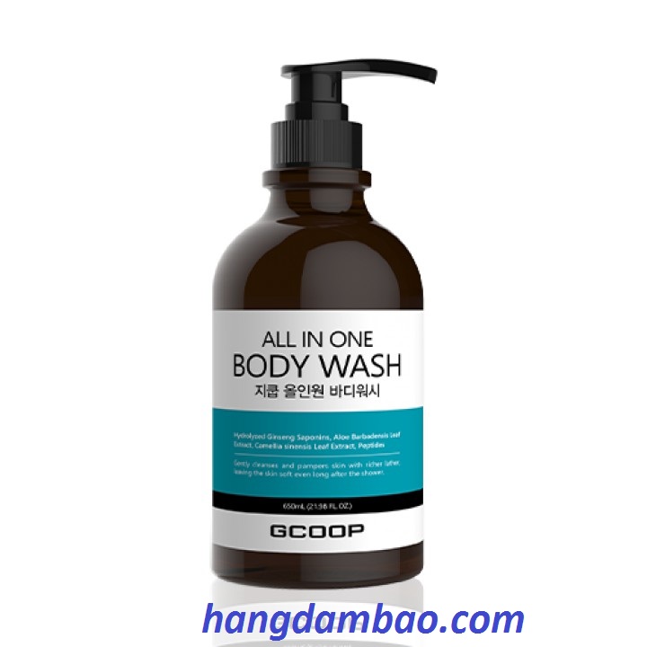 Bao gồm những thành phần sau đây: Acid dừa là hỗn hợp chất béo được chiết xuất từ dầu cọ. Kali cacbonat giúp hòa tan các chất béo trong sữa tắm. Sorbitol Cung cấp độ ẩm trên da, và cân bằng độ pH, ngăn ngừa khô da. Allantoin được chiết xuất từ cây hoa. Chất Betaine tổng hợp từ tự nhiên. Thành phần chiết xuất rau má. Thành phần chứa 3 loại axit hyaluronic: Hydride hyaluronic acid, natri acetylated hyaluronate, natri hyaluronate. Với các thành phần vượt trội Gcoop All In One Body Wash mang đến nhiều công dụng hữu ích: Sạch tế bào da chết: Làn da của chúng ta hàng ngày sẽ sản sinh ra một lượng tế bào chết, các tế bào này kết hợp với các tuyến mồ hôi khi hoạt động tạo ra bụi bẩn. Sản phẩm sữa tắm này có tác dụng làm sạch tế bào chết và làm sạch