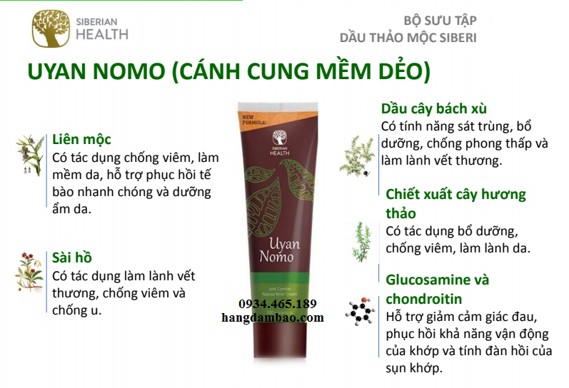Kem bôi xoa khớp Uyan Nomo được chiết xuất 100% từ thảo mộc thiên nhiên vùng Siberi với những thành phần hoạt tính như sau: